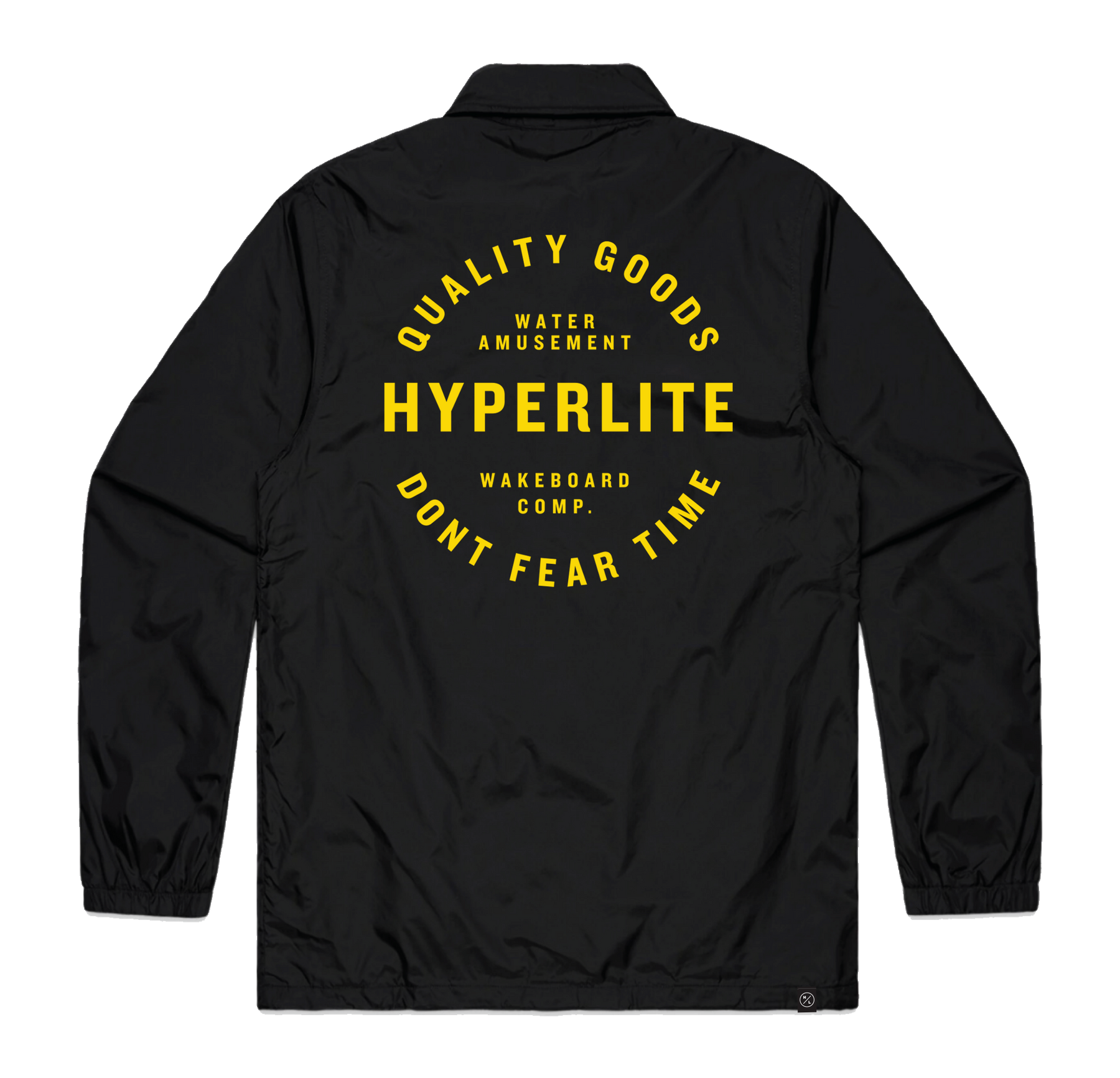 Classic coach button up jacket with Hyperlite patch art FEATURES: • Regular Fit • Light Weight, 2.3oz/yd2 • 100% Nylon Body & Sleeve with Polyester Lining • Collared Jacket • 2 Side Pockets • Elastic Cuffs • Snap Dome & Close • Sizes: S-XXL